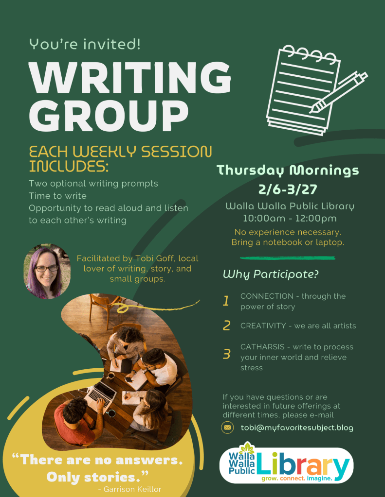 And speaking of facilitating, it’s happening! Here’s the low-down on a new trauma-informed writing group at our local public library, facilitated by yours truly: