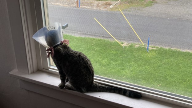 The youngest member of our family is sporting a cone of shame. She’s our six-month-old shorthair female cat, Phiona, and last week she had an overnight stay at the veterinary office to get spayed. We picked her up Wednesday morning, with a page of post-op instructions and a bag of syringes pre-filled with kitten-sized doses of pain medication. The vet assistant who discharged her instructed us to keep her as calm as possible for the next ten days, so we moved her food and litter into my office and there she convalesces.
