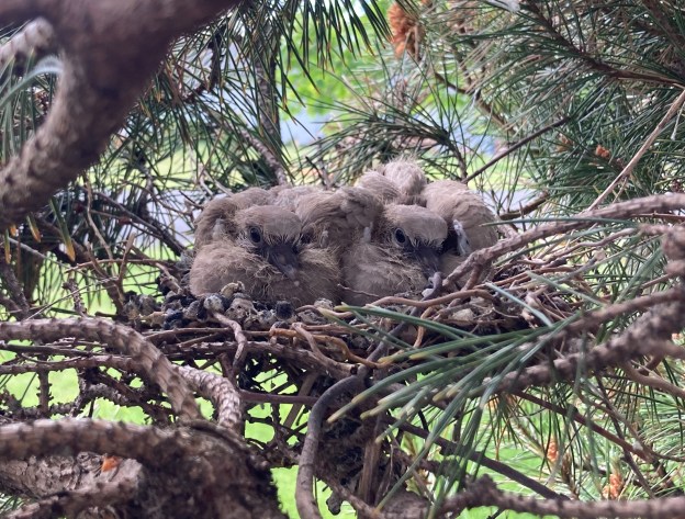 When I think of baby birds, I think of robins: a sturdy, deep nest full of wide-open beaks, voraciously devouring worms and bugs. This spring I’ve learned that mourning doves are sloppy nest builders, and they feed their babies crop milk and partially digested seeds. There’s a nest right outside our front door, and this front-row seat has grown in me a new awareness of the hundreds of different birds and nests and babies, near and far, all busy participating in the circle of life this Spring.